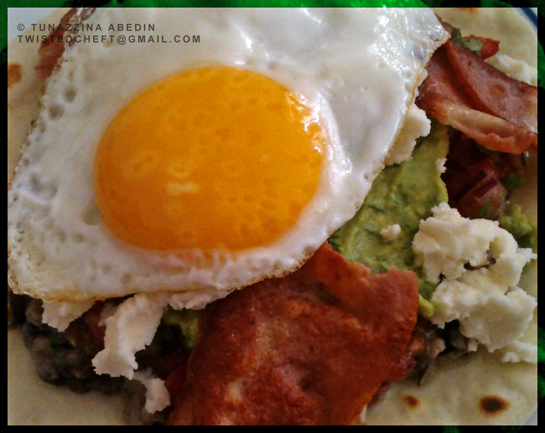 On a plate. place a tortilla. Now spread a generous amount of re-fried beans. Continue with salsa, guacamole and cheese. Place a fried egg on top to finish it off. Now dig in!!!How to make some of the items mentioned above: