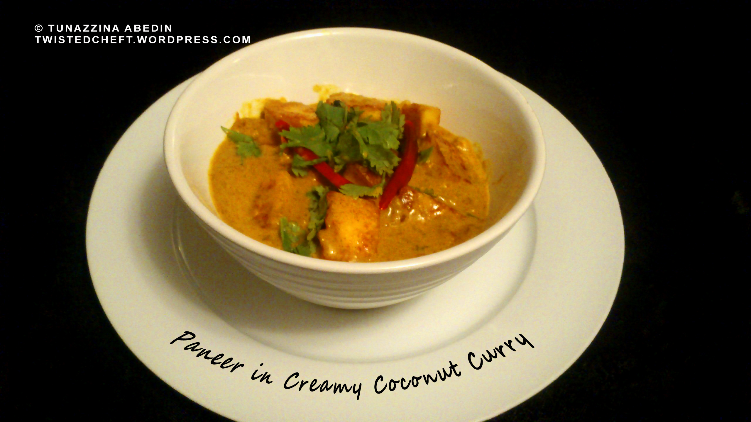 Add finely whole jeera to the oil and once they start to crackle add the onion. Fry onion until slightly golden. Add all the powder spices and cardamom and cinnamon. Stir for 15 to 30 seconds and then add the garlic and ginger and tomato paste. Add a little water and cook the spices. Add coconut milk and bring to a boil. Reduce temperature and add the paneer. Cook for about 5 minutes or until the sauce is desired thickness and spices get into the paneer. If required adjust liquid by adding more coconut milk or water. Add green chili and salt according to taste. Serve with white rice or naan.